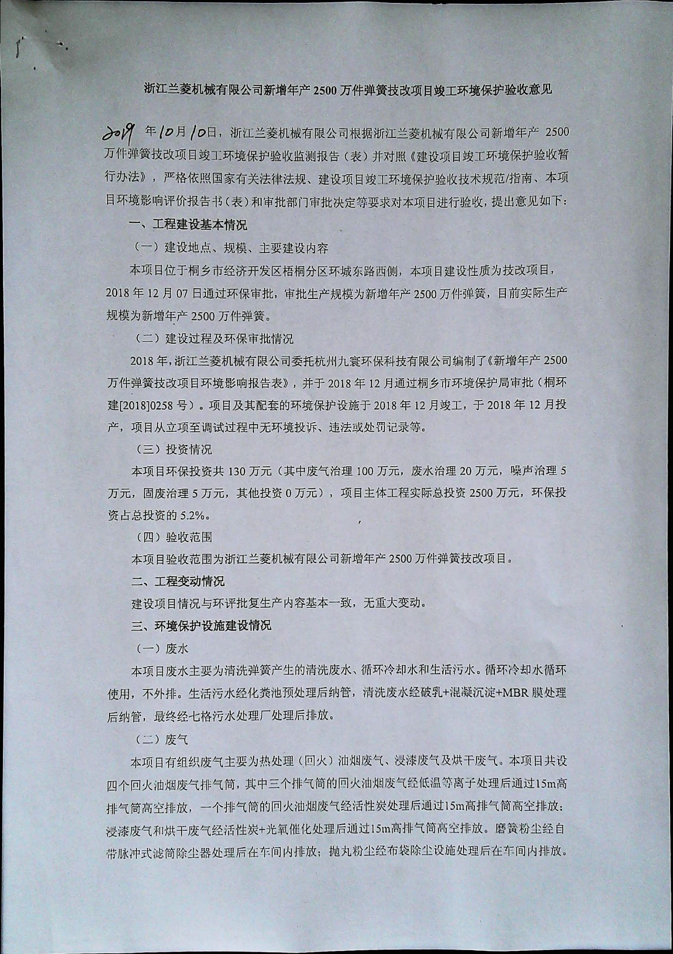 浙江蘭菱機(jī)械有限公司新增年產(chǎn)2500萬件彈簧技改項目竣工環(huán)境保護(hù)驗收意見
